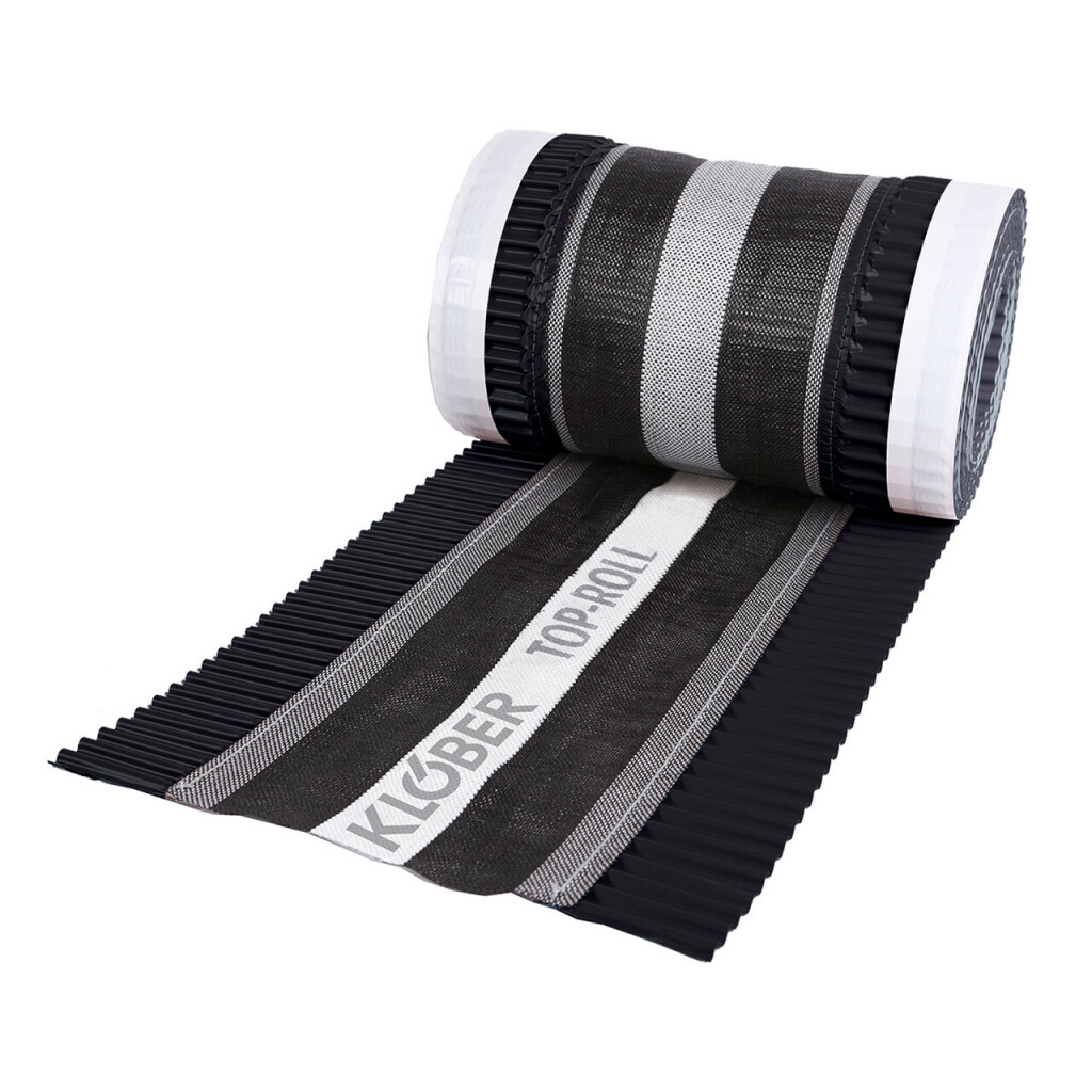 Die Gittergeweberolle Top-Roll zeichnet sich besonders durch hohe Lüftungseigenschaften aus. Aufgrund der Breitenvielfalt von 210 mm, 310 mm und 390 mm in Verbindung mit einer Dehnreserve von 30% im Seitenstreifen ist die Rolle flexibel für flach bis stark profilierte Dachsteine bzw. Dachziegel geeignet. Der AluminiumSeitenstreifen ist mit dem Mittelteil verklebt und zusätzlich vernäht, sodass die Rolle eine sehr hohe Reißfestigkeit hat. Die robuste Gittergewebestruktur schützt den First- bzw. Gratbereich vor Schnee- und Regeneintrieb. Das Nagelband sorgt für eine optimale Ausrichtung auf der Firstlatte und vereinfacht die Verlegung.