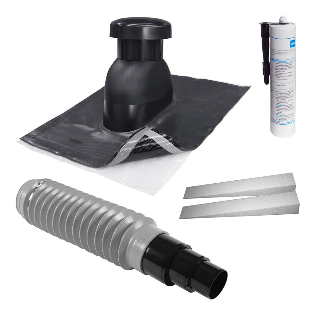 | Material Beschreibung | Manschette aus Polyisobutylen mit Alu-Streckgittereinlage und umlaufender Butylkleberaupe, Lüfterhaube aus Polypropylen mit abnehmbarer Haube, Anschlussrohr aus verzinktem Stahl mit Wärmedämmung |
