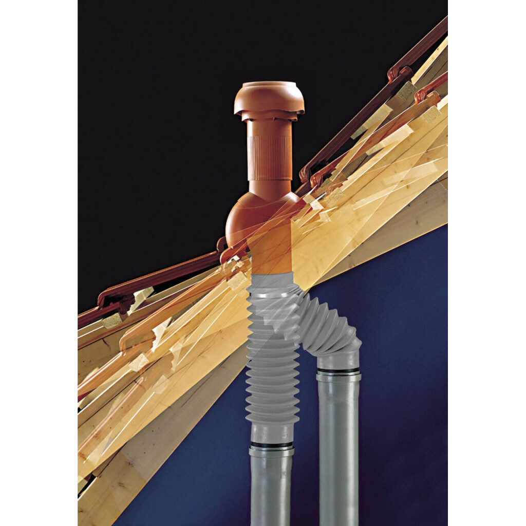 Der aus einem hochwertigen, speziellen Weich-PVC gefertigte Venduct Flex-Anschlussschlauch bietet eine höhere Beständigkeit und ermöglicht dauerhaft dichte Verbindungen. Der Schlauch ist dauerhaft UV-stabil, was speziell für den Einsatz bei Grundleitungslüftungen ohne Abdeckung erforderlich ist. Durch die höhere Wandstärke ist er auch sehr robust gegenüber mechanischen Einflüssen. Der Flex-Anschlussschlauch überbrückt Längendifferenzen und gleicht Achsversätze zwischen Dachdurchgang und HT-Leitung aus. Der angespritzte Adapter gewährleistet eine Dichtigkeit, so dass der Flex-Schlauch auch waagerecht in die Muffenverbindung eingeführt werden darf.