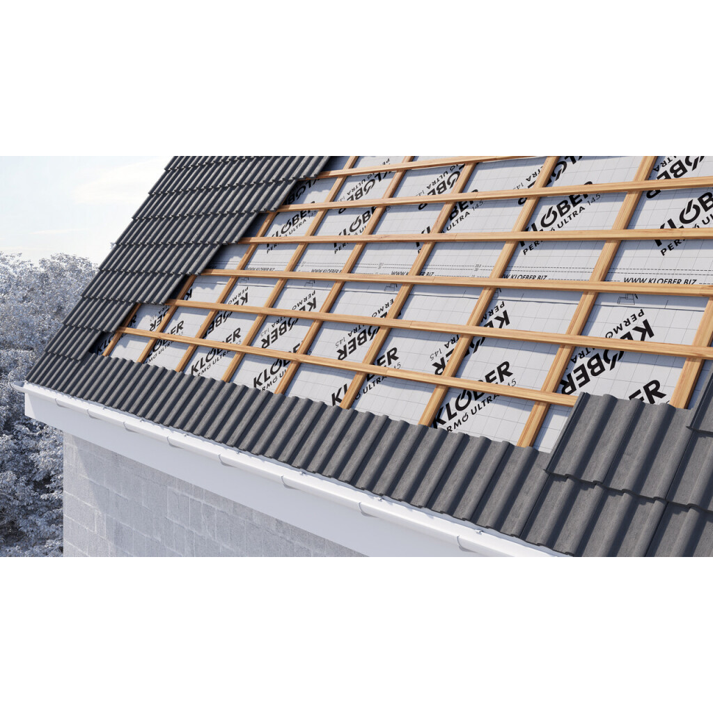 Die Permo Ultra 145, ehemals Permo Easy, ist eine hochdiffusionsoffene Unterdeckbahnen in bewährter Qualität, die sich für eine Vielzahl an Standardprojekten eignet. Sie verfügt über drei Lagen und zeichnet sich durch Stabilität und Langlebigkeit aus. Auf der Unterseite ist ein spezielles, stabiles Spinnvlies aufkaschiert, das eine problemlose Verlegung auch auf Schalung ermöglicht. Daher kann die Bahn auch für Bedachungsmaterialien in Direktauflage (z.B. Schiefer) eingesetzt werden. In der Ausführung mit Doppel-Selbstklebestreifen kann Ultra 145 als naht- und perforationsgesicherte Unterdeckung auch für zu Wohnzwecken genutzte Dachräume eingesetzt werden. Diese Version bietet doppelte Sicherheit und ermöglicht eine winddichte und energieeffiziente Verklebung, auch bei Feuchtigkeit und Staub. Permo Ultra 145 entspricht der Klasse UDB-A/USB-A des ZVDH und ist in Kombination mit den Original Klöber Klebe- und Dichtprodukten als Behelfsdeckung zugelassen.